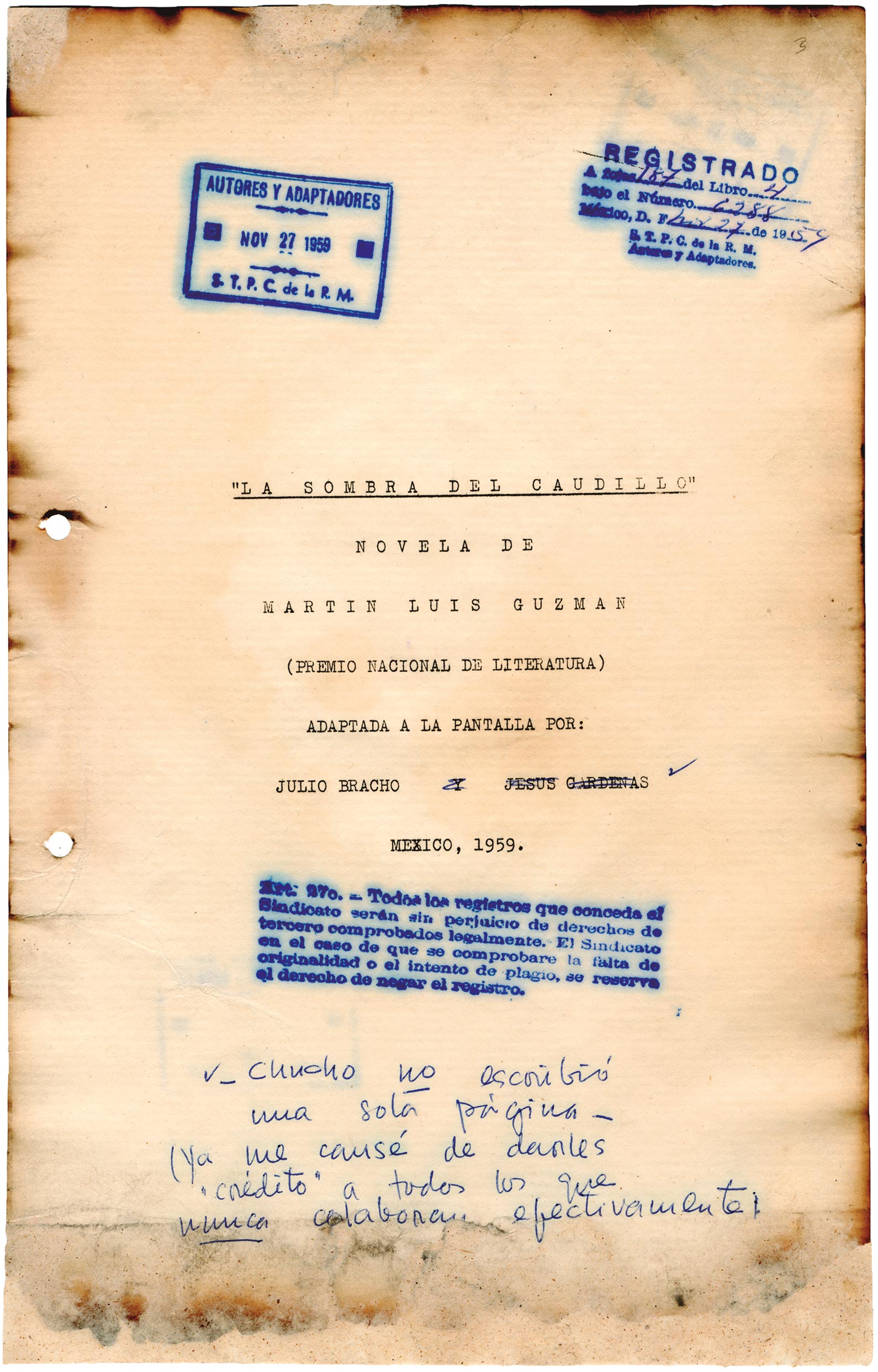 Imagen de portada: Portada y páginas 24 a 29 del guion de La sombra del caudillo, 1960. Donación de Diana Bracho, 2014. Restauración, conservación y reprografía de la Filmoteca.
